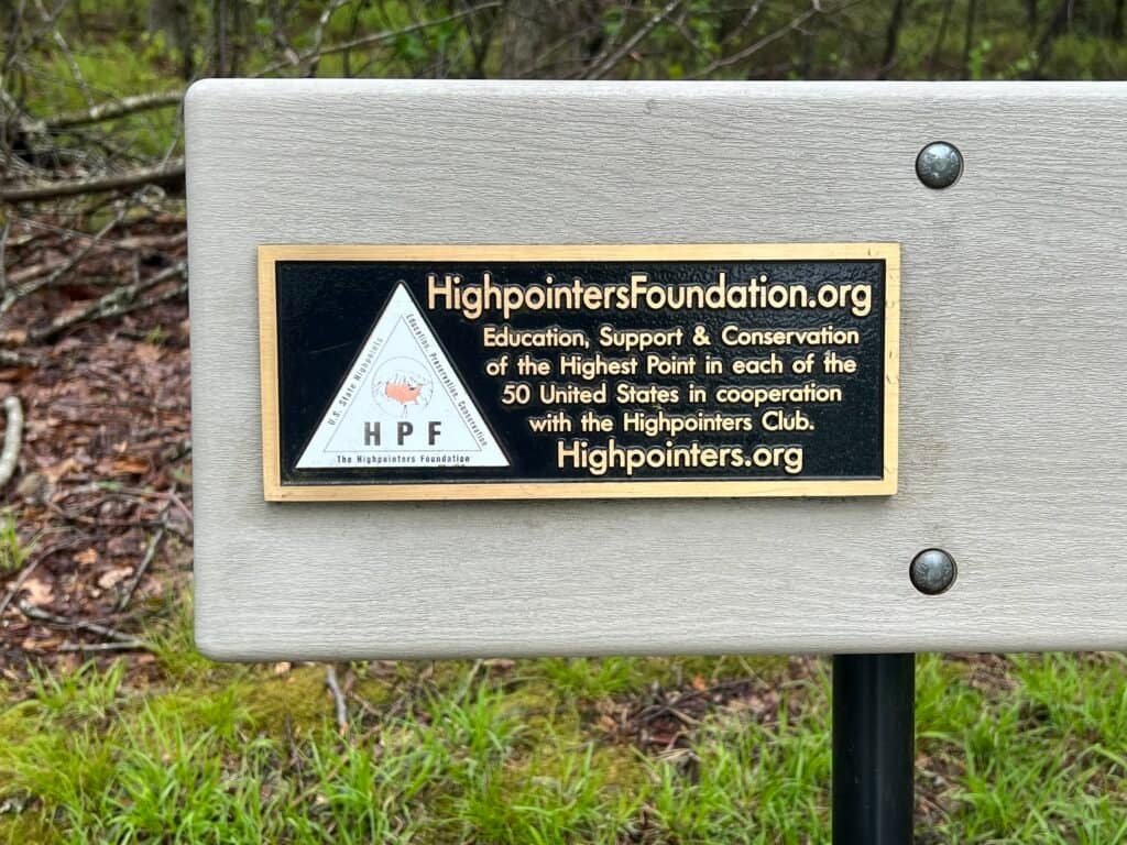 There isn’t much at the summit, but it has the essentials: a marker and sign, a small cairn, a picnic table, a bench sponsored by the High Pointers Club, and a mailbox containing a register to sign.