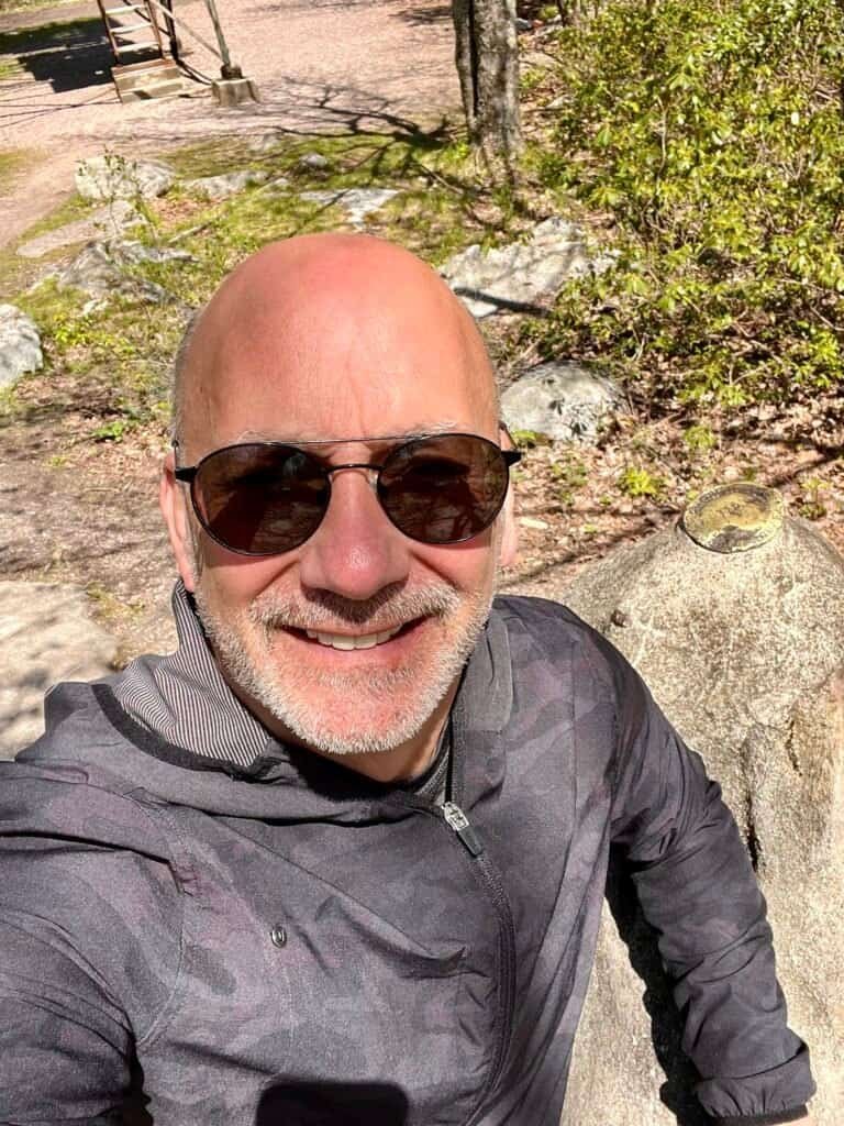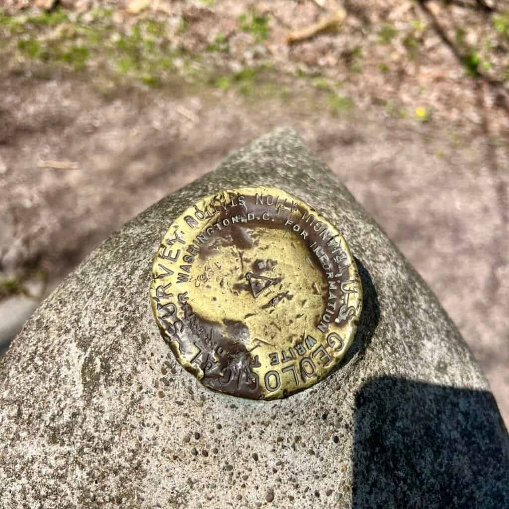 Once I reached the summit area, I found a plaque marking the high point and outlining the surrounding trails. A short walk toward the observation tower leads to a large boulder that holds the survey marker for the true summit.