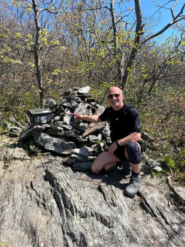 After tagging Connecticut’s high point, I continued west toward the New York–Massachusetts border marker. The descent includes more boulder scrambling, but the payoff is a classic highpointer moment: standing in three states at once.